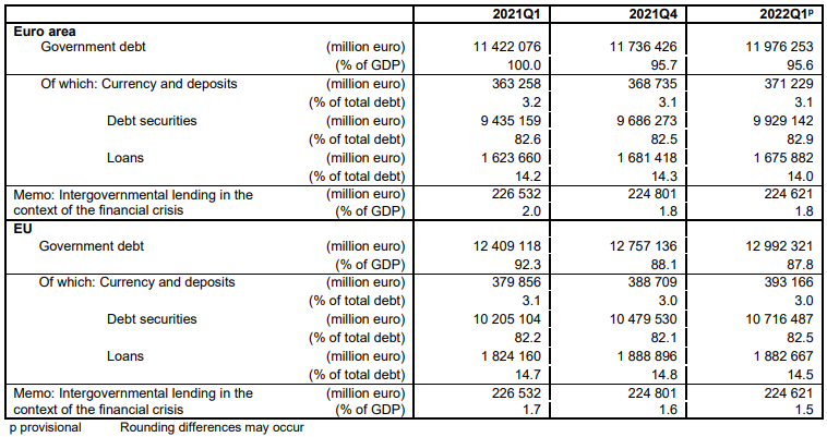 Em comparação com o 4º trimestre de 2021, oito membros da UE registaram um aumento da dívida pública em relação ao PIB no final do 1º trimestre de 2022; 19, uma diminuição. Os aumentos foram observados em França (+1.9%), Itália (+1.8%), Chipre (+1.3%), Malta (+1.2%), Áustria (+1.1%), República Checa (+0.8%), Hungria (+0.7%) e Eslovénia (+0.4%). As maiores diminuições foram registadas na Grécia e Lituânia (ambas -4%), Dinamarca (-3.7%), Croácia (-2.5%), Irlanda e Bulgária (ambas -2.2%).